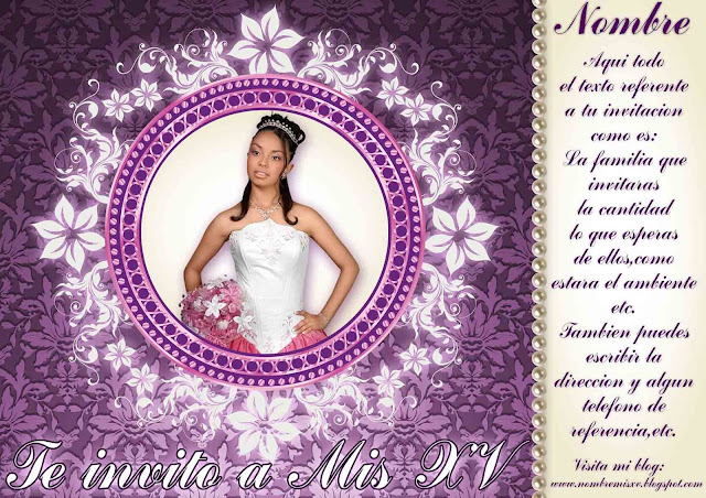 Plantilla para foto invitacion de 15 años. Medida 8.5 X 6 pulgadas y resolucion fotografica de 300 dpi's. La mascarilla cuenta con 6 capas, y es editable en Photoshop y CorelDRAW.